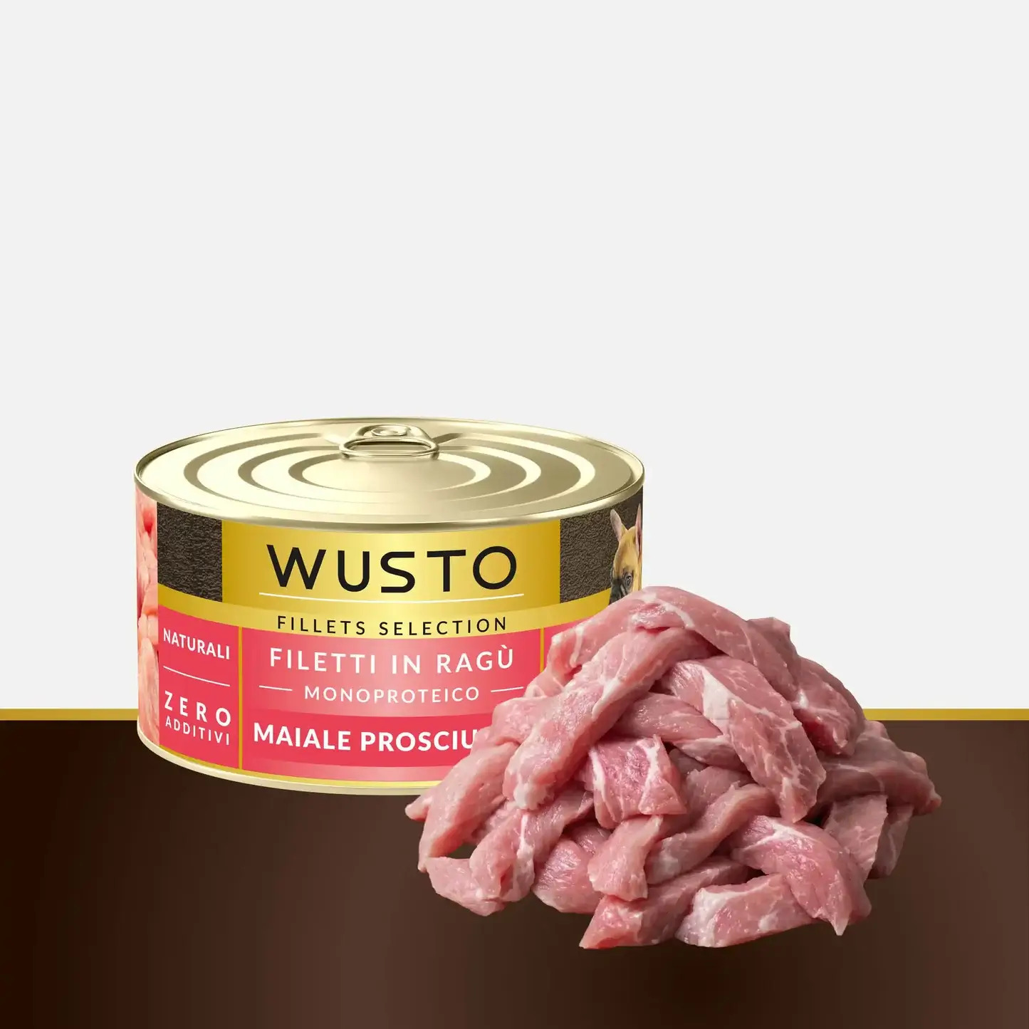 Wusto dog filetti in ragù monoproteico maiale e prosciutto è una ricetta con solo carne di maiale e prosciutto, fonti di proteine nobili e digeribili, ideale per digestione sensibile e intolleranze del tuo cane.