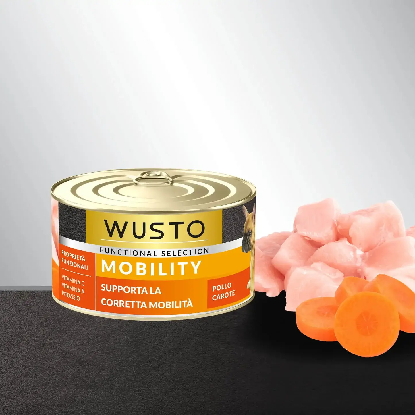 Wusto dog patè Mobility pollo e carote, alimento funzionale 100% naturale, formulato per il benessere e la mobilità del cane.